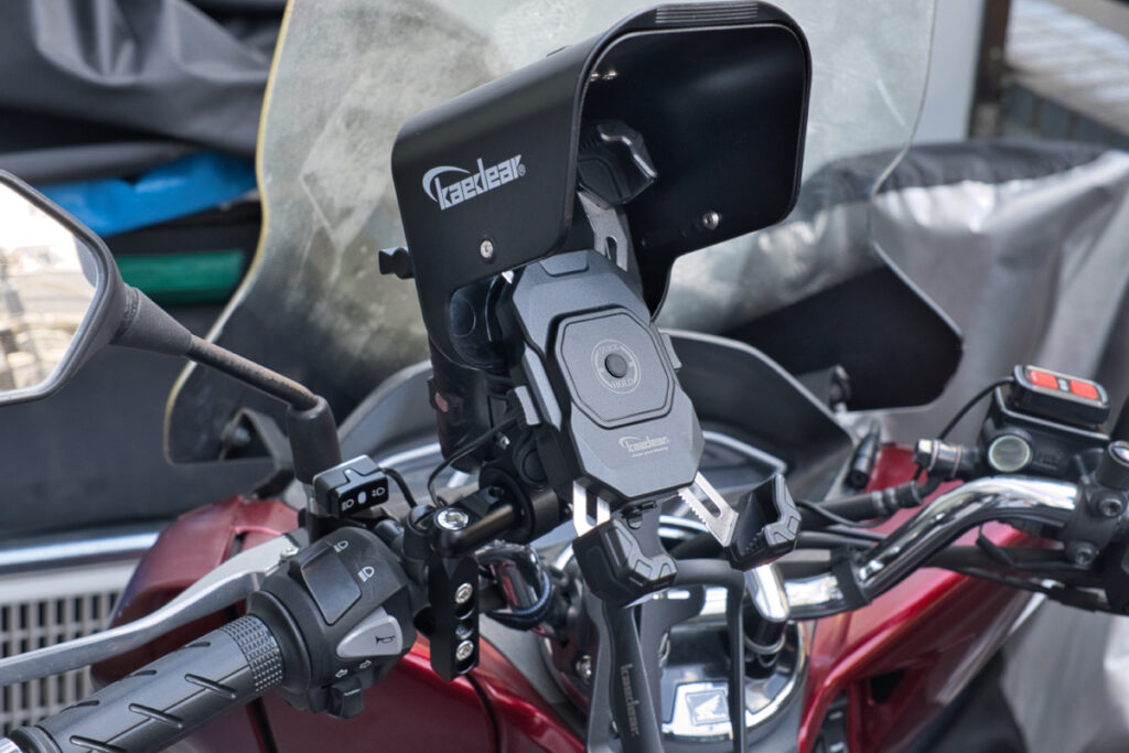 配達中はスマホをホルダーに固定することで常に充電を行いながら、行き先を確認することができるのがいいですね。またバイザーを使用することでスマホの画面を見やすくすることができたり、急な雨からスマホを保護することも可能です。
