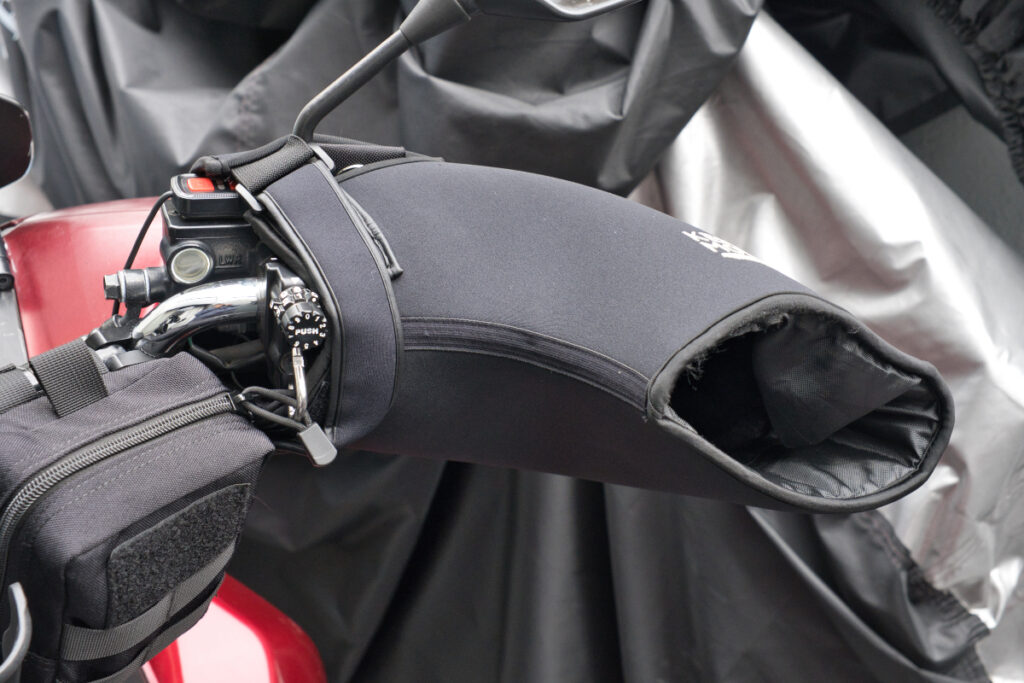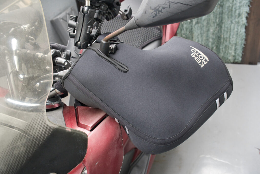 KEMITOMOハンドルカバーはハンドル部分を全て覆って使用する構造となっており、先ほど紹介したデイトナのヘルメットロックが隠れてしまうのがデメリットですね。