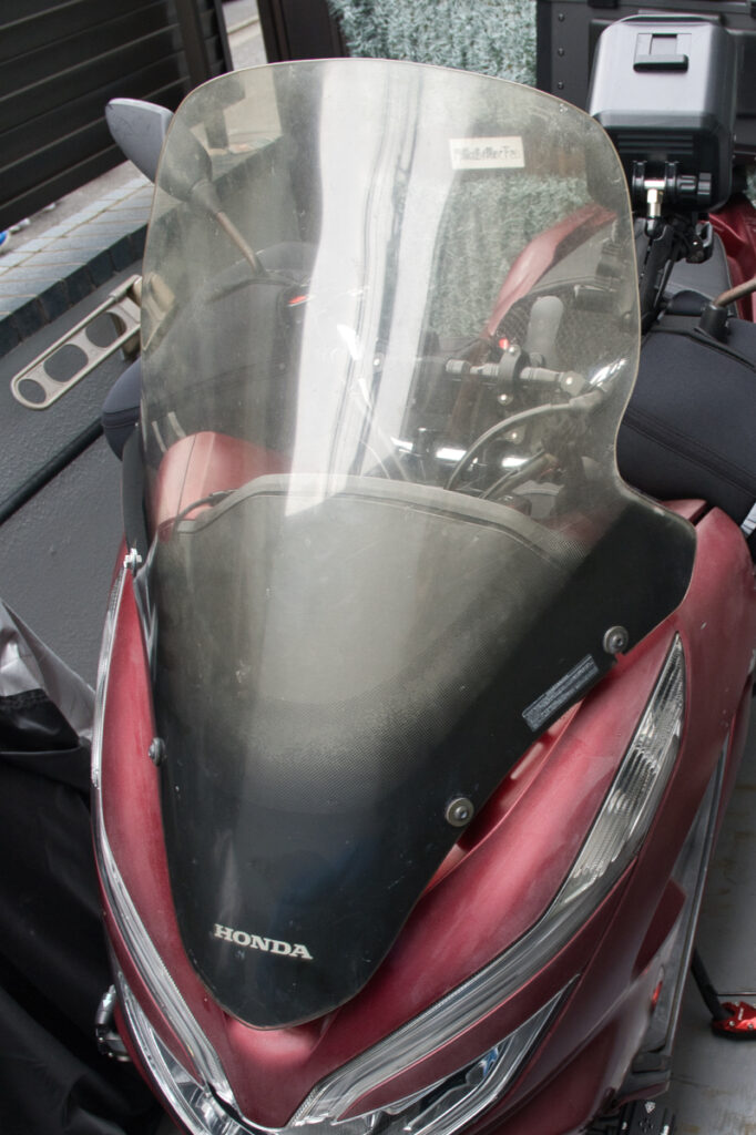 まずはHONDA純正のロングスクリーンですね。PCX150を購入した際に前オーナーが使用していたものをそのまま使用しているため、塗装が剥げたり傷がついているため見栄えは良くないですが、雨風を当たりにくくする効果があります。