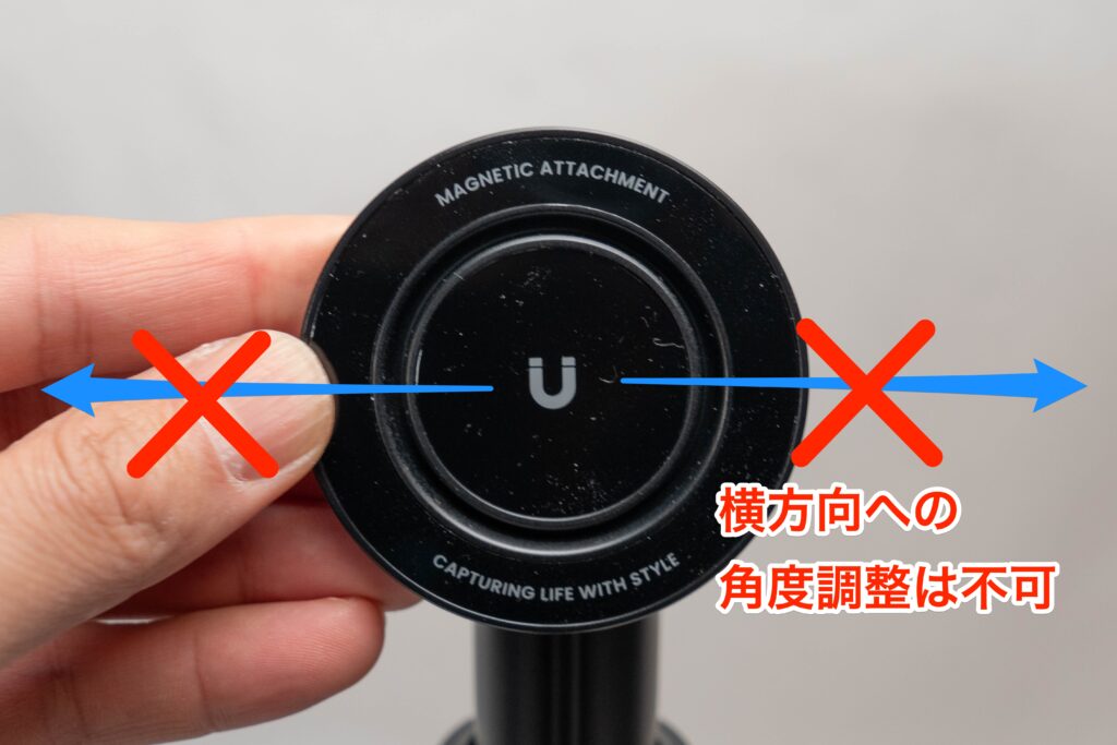 KraftGeek JustTap マグネティックフォン三脚のスマホを固定するMagSafe部分ですが、縦方向への角度調整はできるものの、横方向への角度調整は不可となっています。