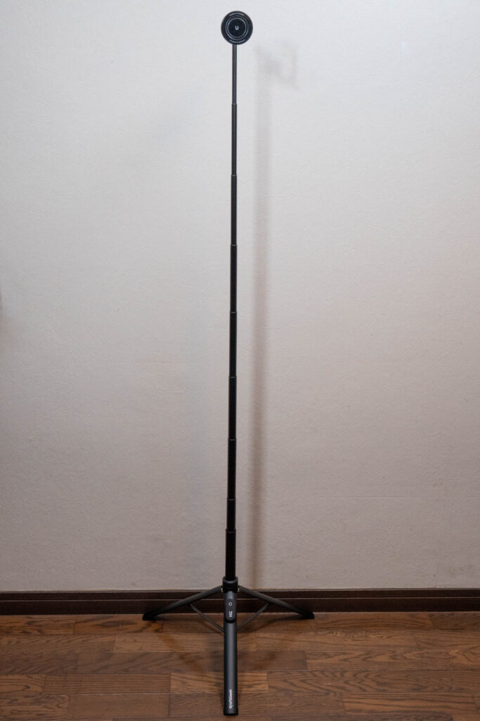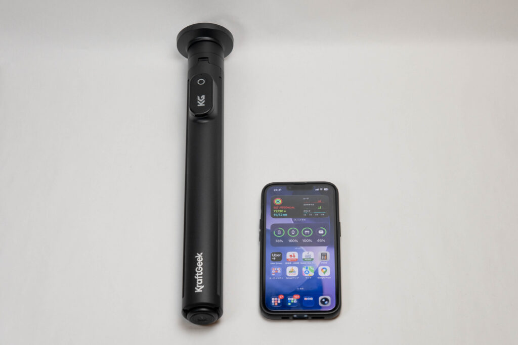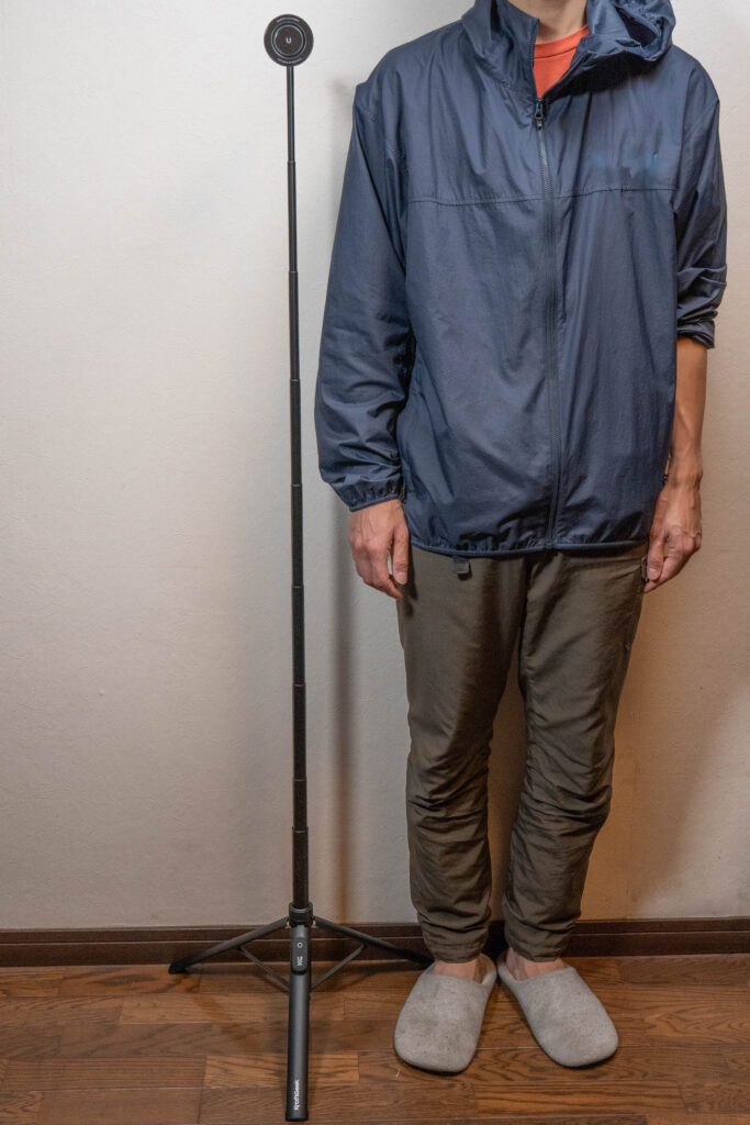 175cmの筆者と高さを比べたのが上記の写真ですが、大体肩くらいまでの高さまで伸ばすことが可能なため、よっぽど背の高い方でなければ立った状態での自撮りも撮影ができる仕様となっています。