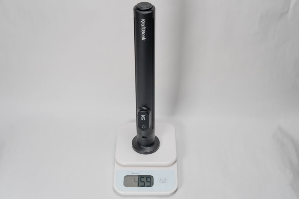 KraftGeek JustTap マグネティックフォン三脚の重さについてですが、スケールで計測したところ459gとなっていました。