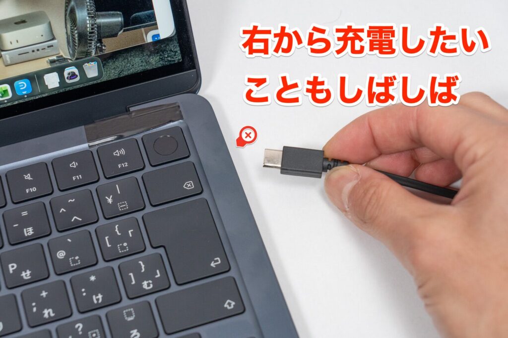 オフィス等で Mac を使う際に電源の取り口がいつも左側の方が近いというわけでもなく、様々な場所で電源を取る必要があるため、場合によっては長めのUSB-Cケーブルが必要となる場面も多いなと感じました。