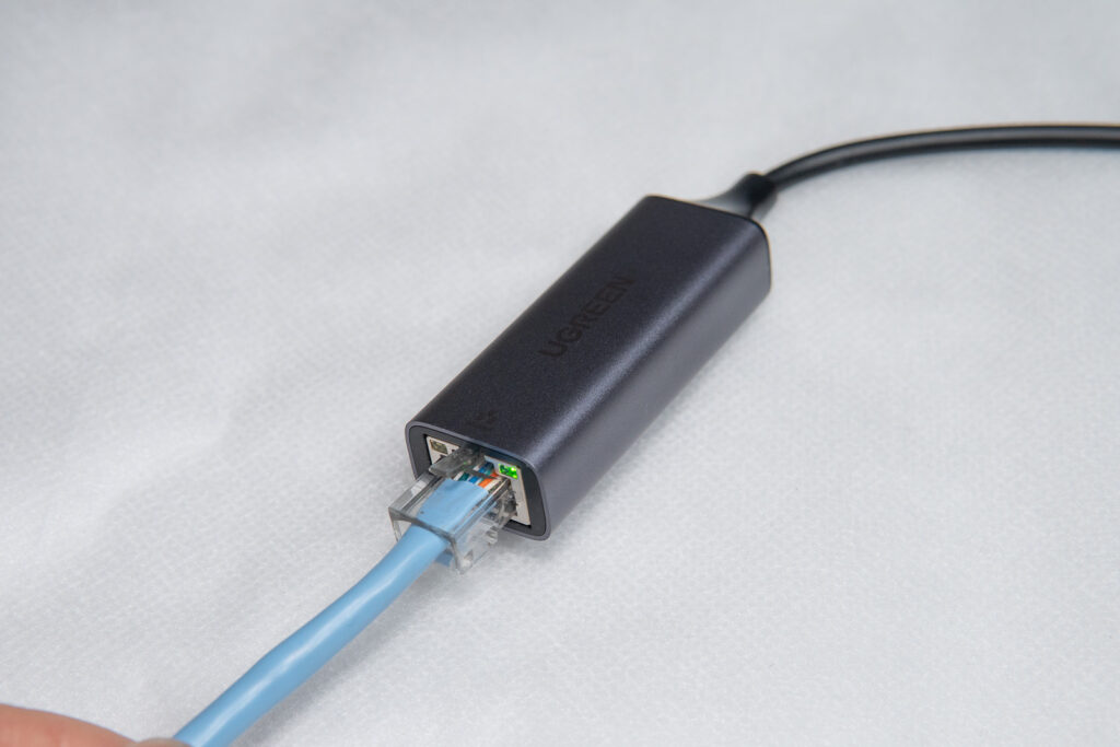 筆者は外出先でMacBook Airを使用する際にイーサネットを使用する機会がよくあるのですが、UGREENの有線LANアダプターはType-Cポートにアダプターをかませるだけで簡単にイーサネット環境を構築することが可能です。