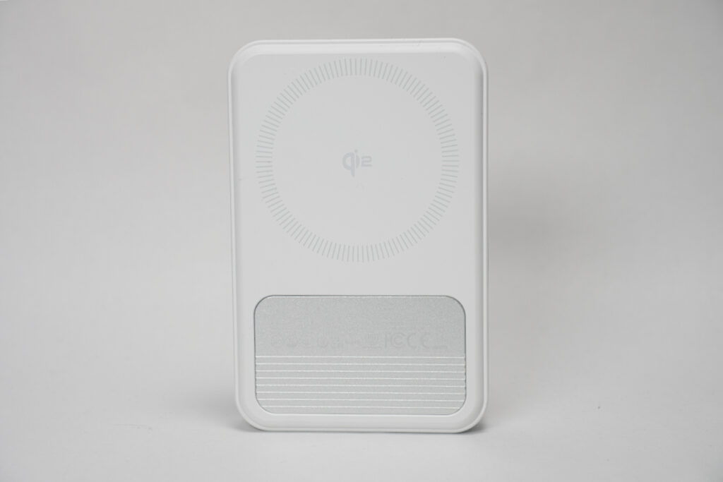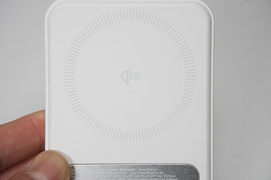 背面を確認すると、Qi2の無線充電に対応しており、iPhone12以降のスマホであれば最大15Wで充電することが可能です。