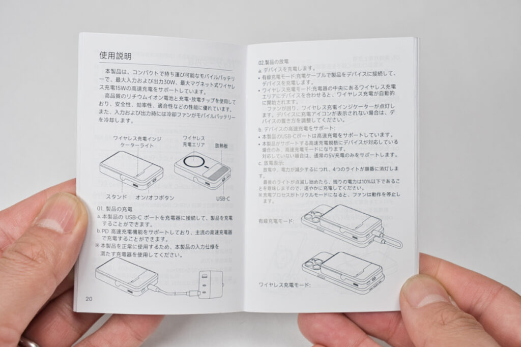 同梱物についてですが、モバイルバッテリー本体とは別に取扱説明書と短いUSBケーブルが同梱されていました。