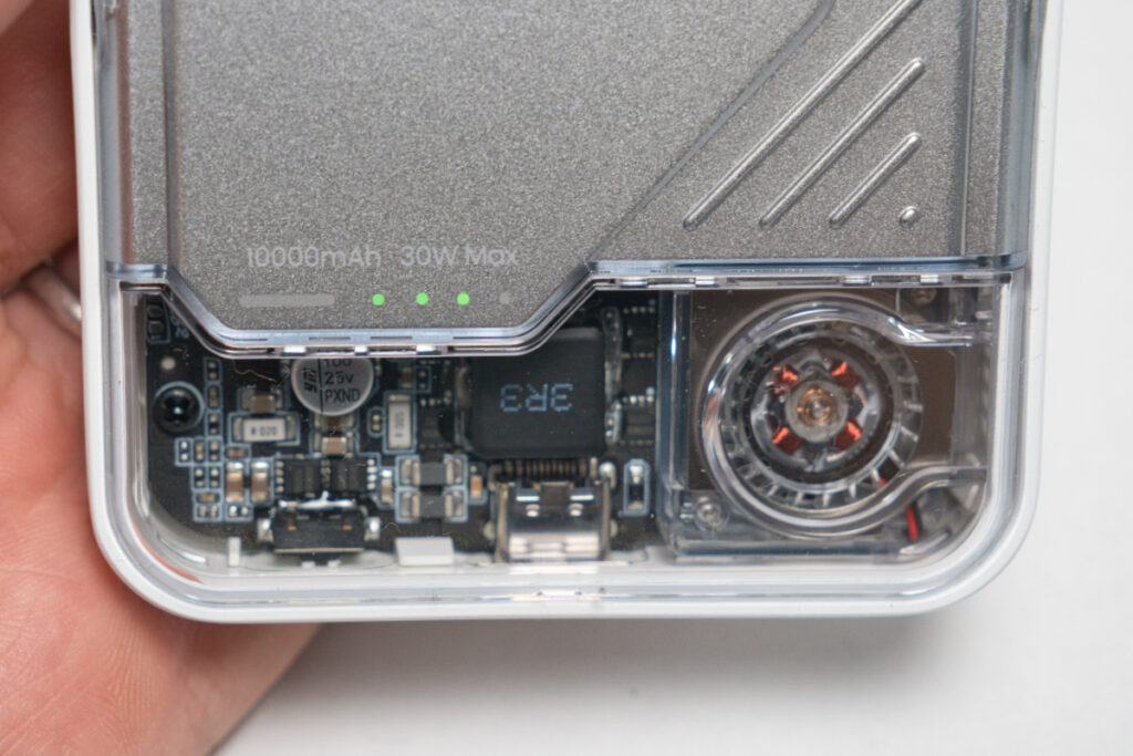 冷却ファンを回すことでモバイルバッテリー本体が熱くなりすぎるのを防ぎつつ、見た目でも楽しませてくれる演出が面白いですね。