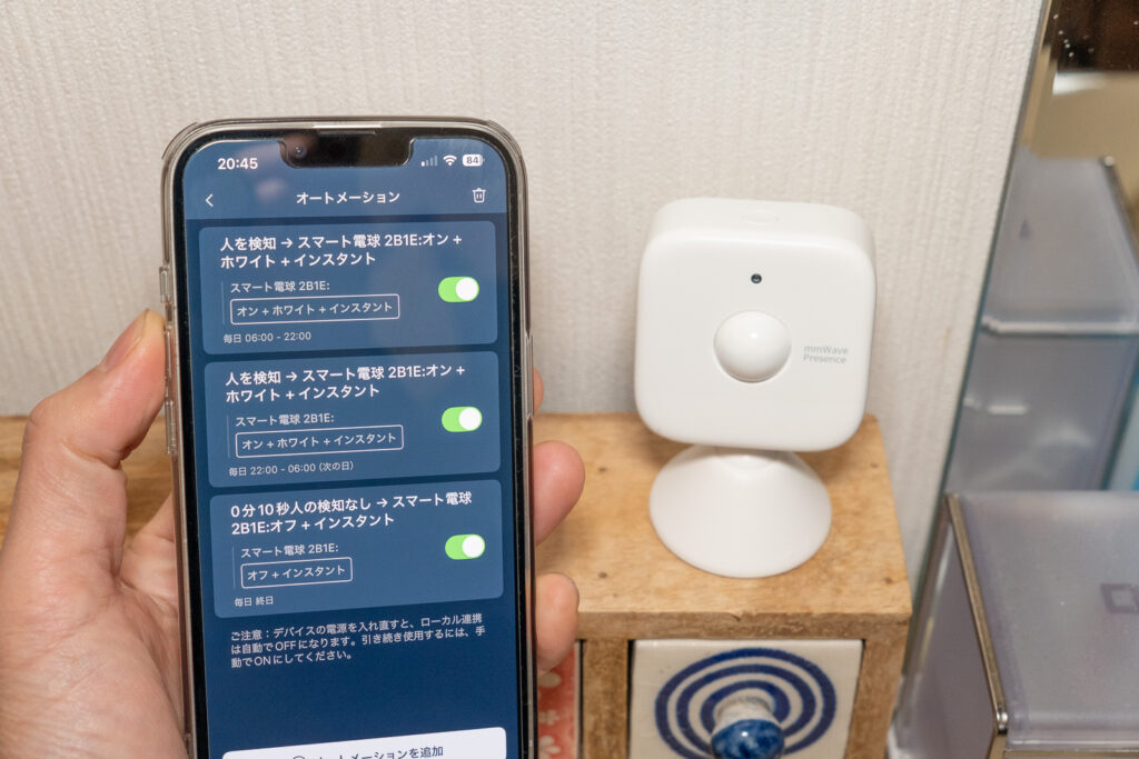 - 6:00~22:00に人感センサーが反応するとスマート電球は昼白色の100%で点灯