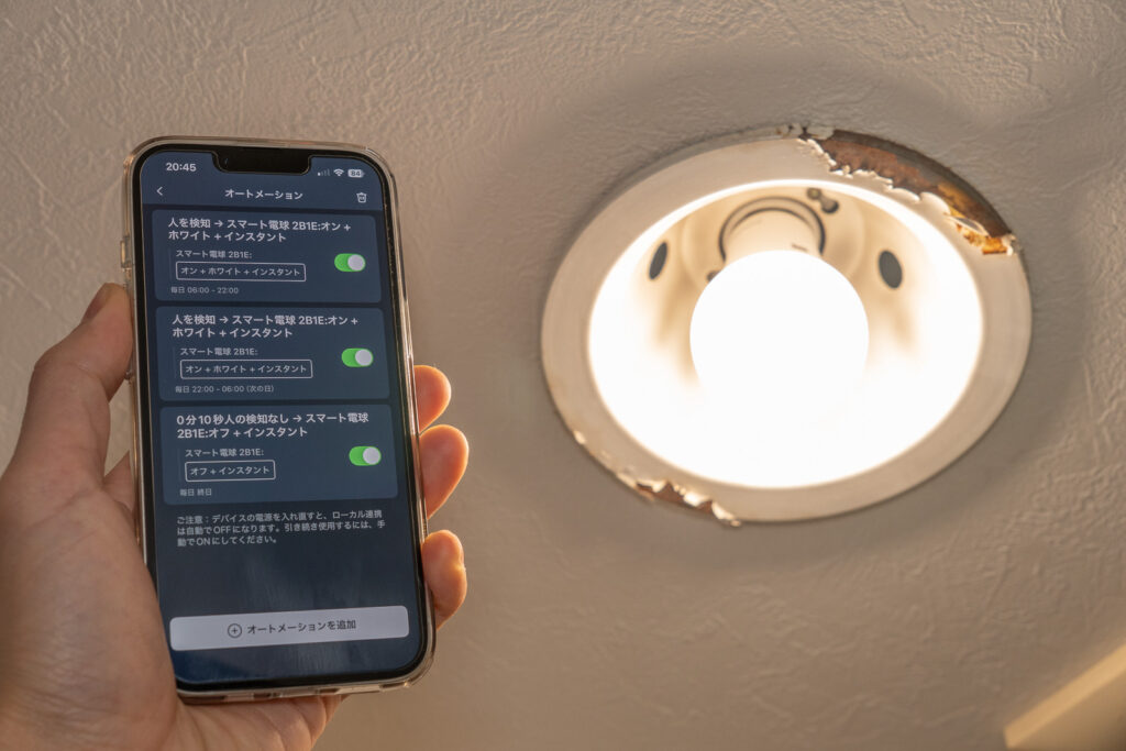 また夜の時間帯に人感センサーが反応するとスマート電球は電球色に点灯する、といったような身体や目に負担のない運用を自動化することができています。