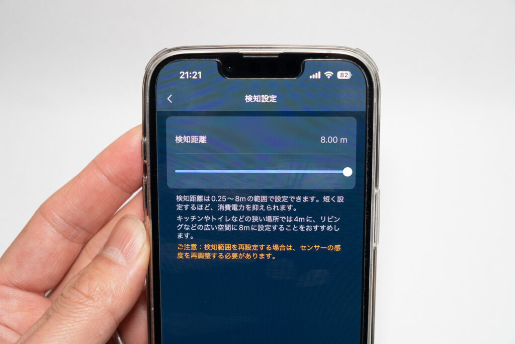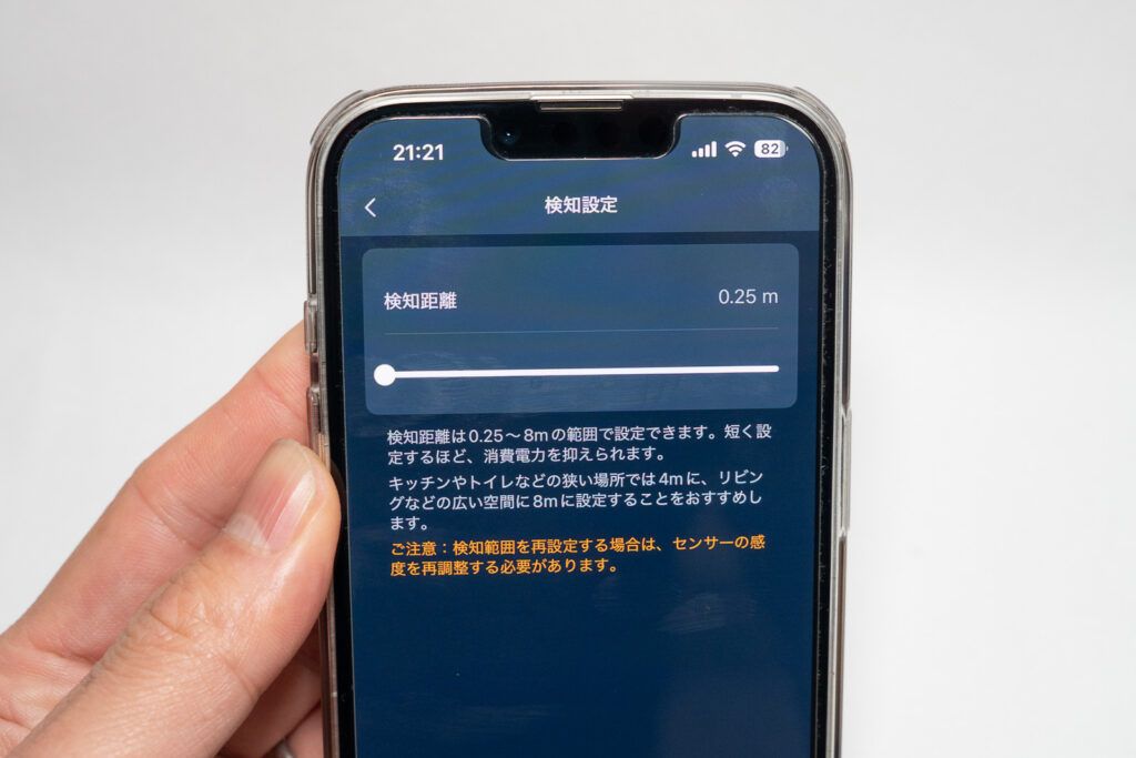 上記の画像を見ていただくとわかりますが、0.25m〜8.00mの範囲で設定が可能となっており、筆者の自宅で色々テストしてみたところ1.75mで設定すると入り口に入ってすぐにスマート電球が点灯することができました。