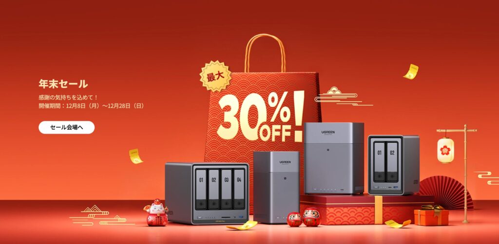 現在では2025年12月12日現在ですが、UGREEN NASでは年末セールを実施しています。